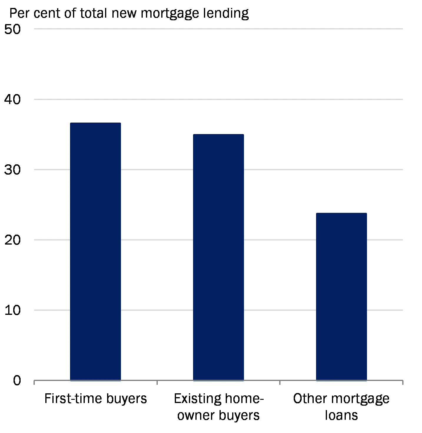 | Note: The chart is based on data for the mortgage credit institutions' net new lending for the whole of 2020. Net new lending is defined as lending that increases the outstanding bond debt for a borrower between two periods. The loan-to-value ratio is based on mortgage debt. First-time buyers are defined as borrowers who have not previously been registered as having home loans in Statistics Denmark's registers. Other home loans are defined as loans where there has not been a change of address for the household during the same period. These include top-up loans and refinancing. Source: Own calculations based on register data from Statistics Denmark |