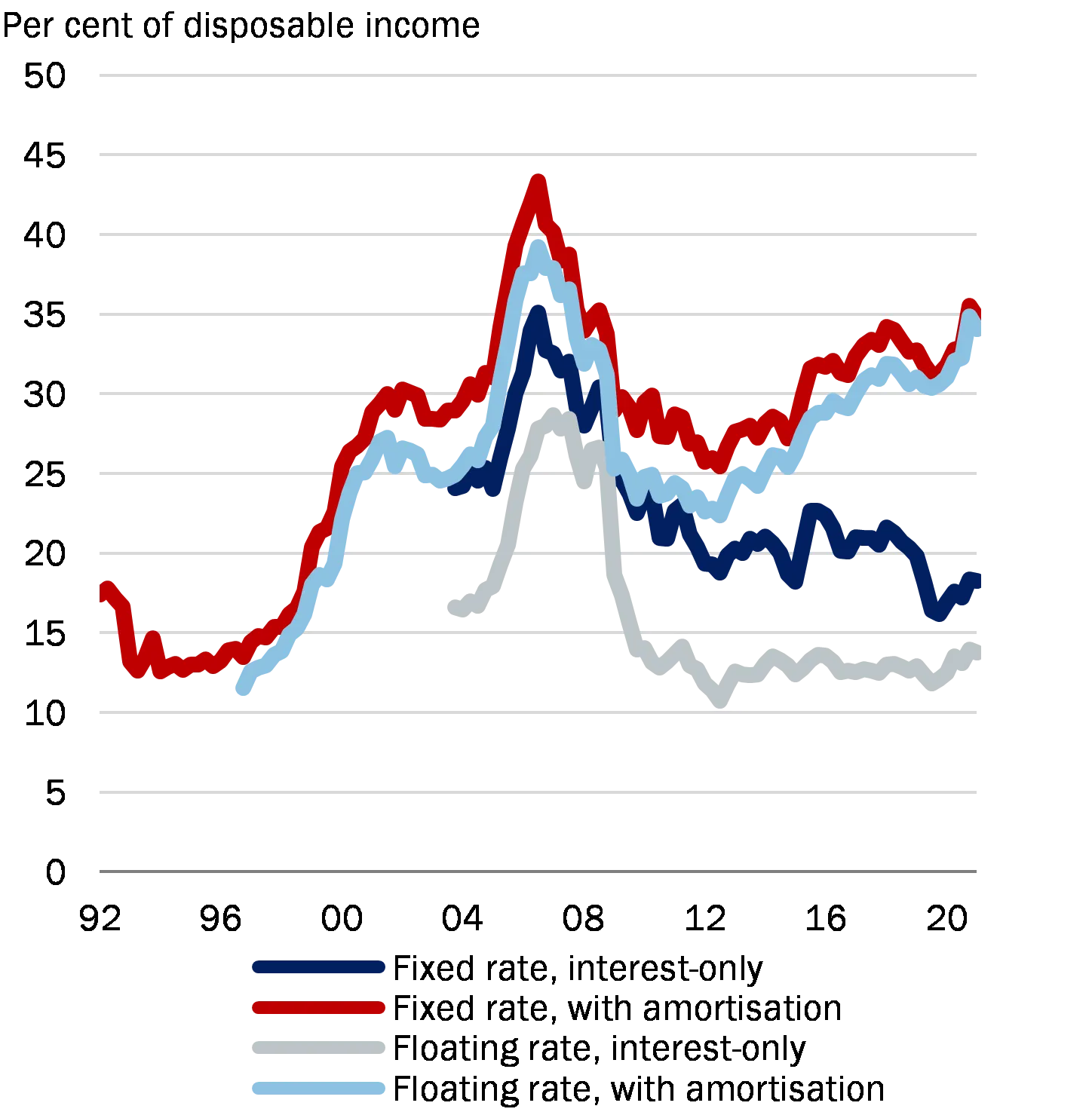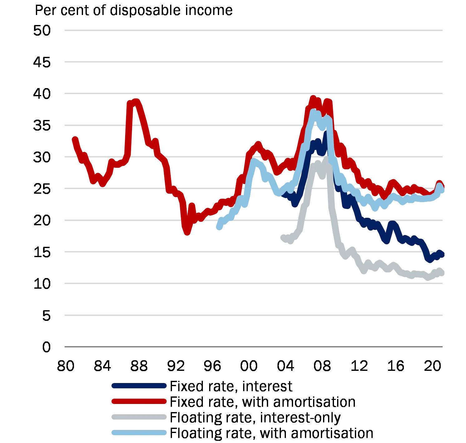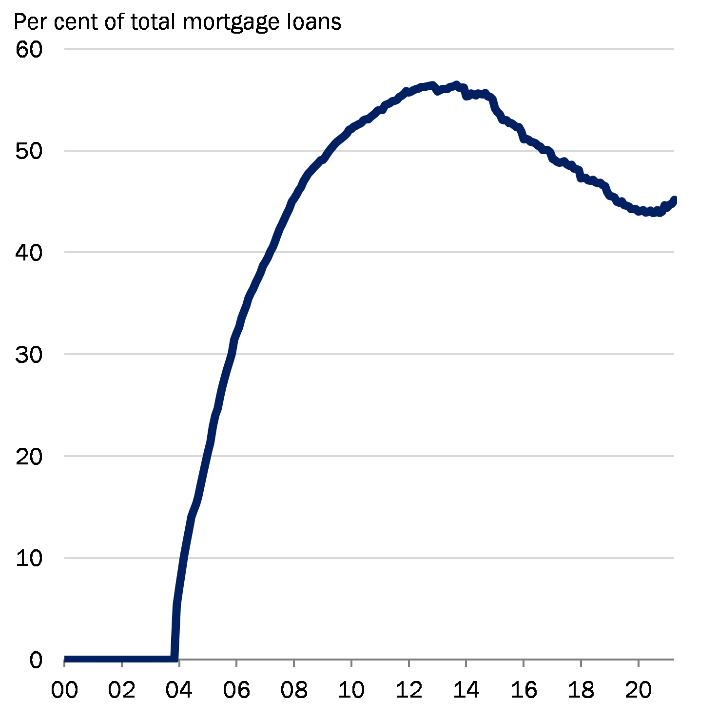 The current lending rules do not adequately address the systemic risks associated with the continued widespread use of deferred amortisation. In 2020, 73 per cent of mortgage credit institutions' net new lending was with a loan-to-value ratio above 60 per cent, see Chart 1. Among the most highly indebted borrowers, with a loan-to-value ratio above 60 per cent, 44 per cent of net new lending was with deferred amortisation. Today, the most highly indebted borrowers are more inclined to choose fixed interest rates rather than variable rates. This should be seen in light of a decrease in long-term interest rates and the Government’s implementation of the Council's recommendation from 2017. It reduces the borrower's interest rate risk and shields the home equity against house price falls resulting from interest rate increases, but it does not address the systemic risks associated with homeowners being able to leverage themselves up to very high levels when both short-term and long-term interest rates are very low.