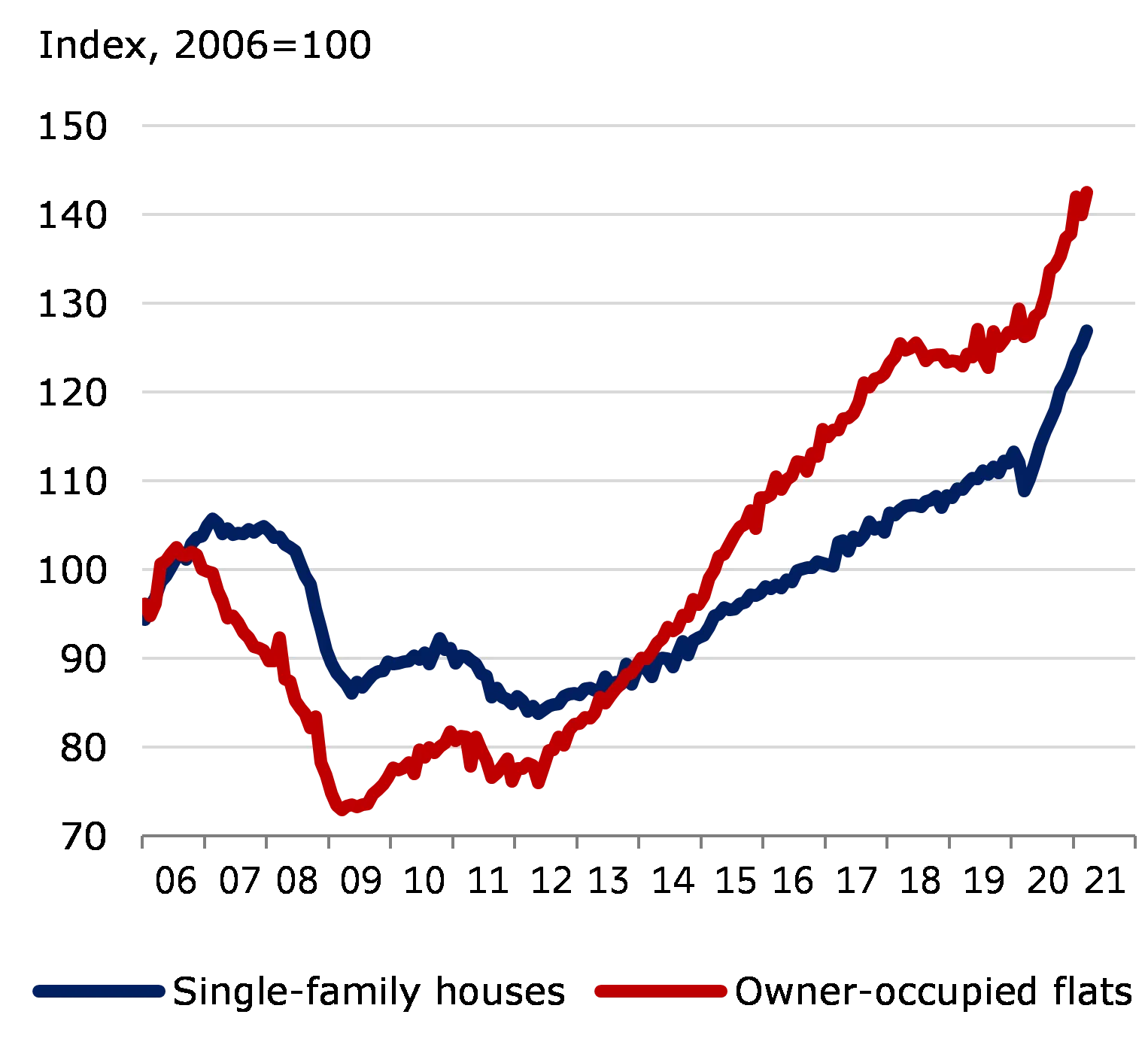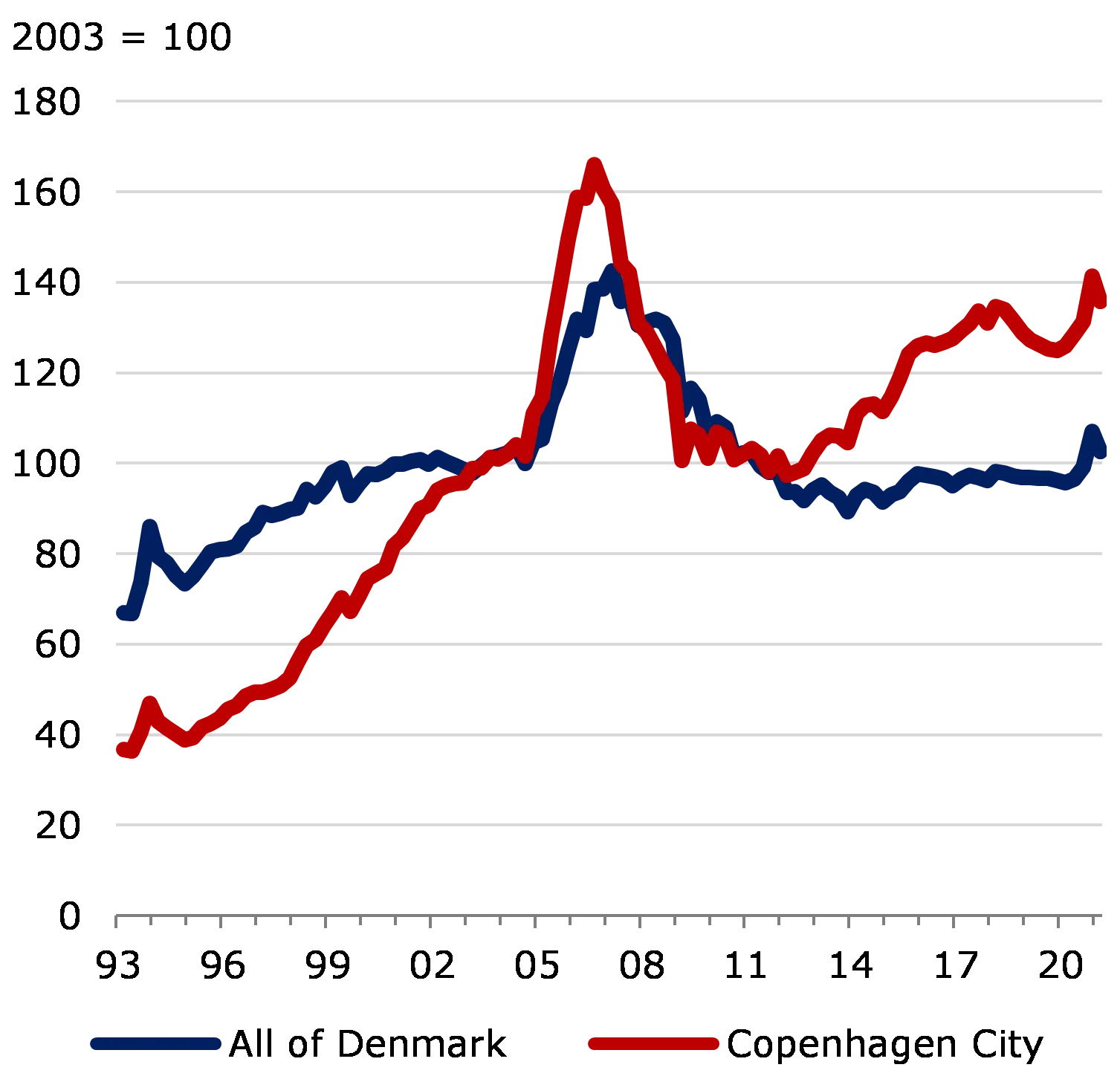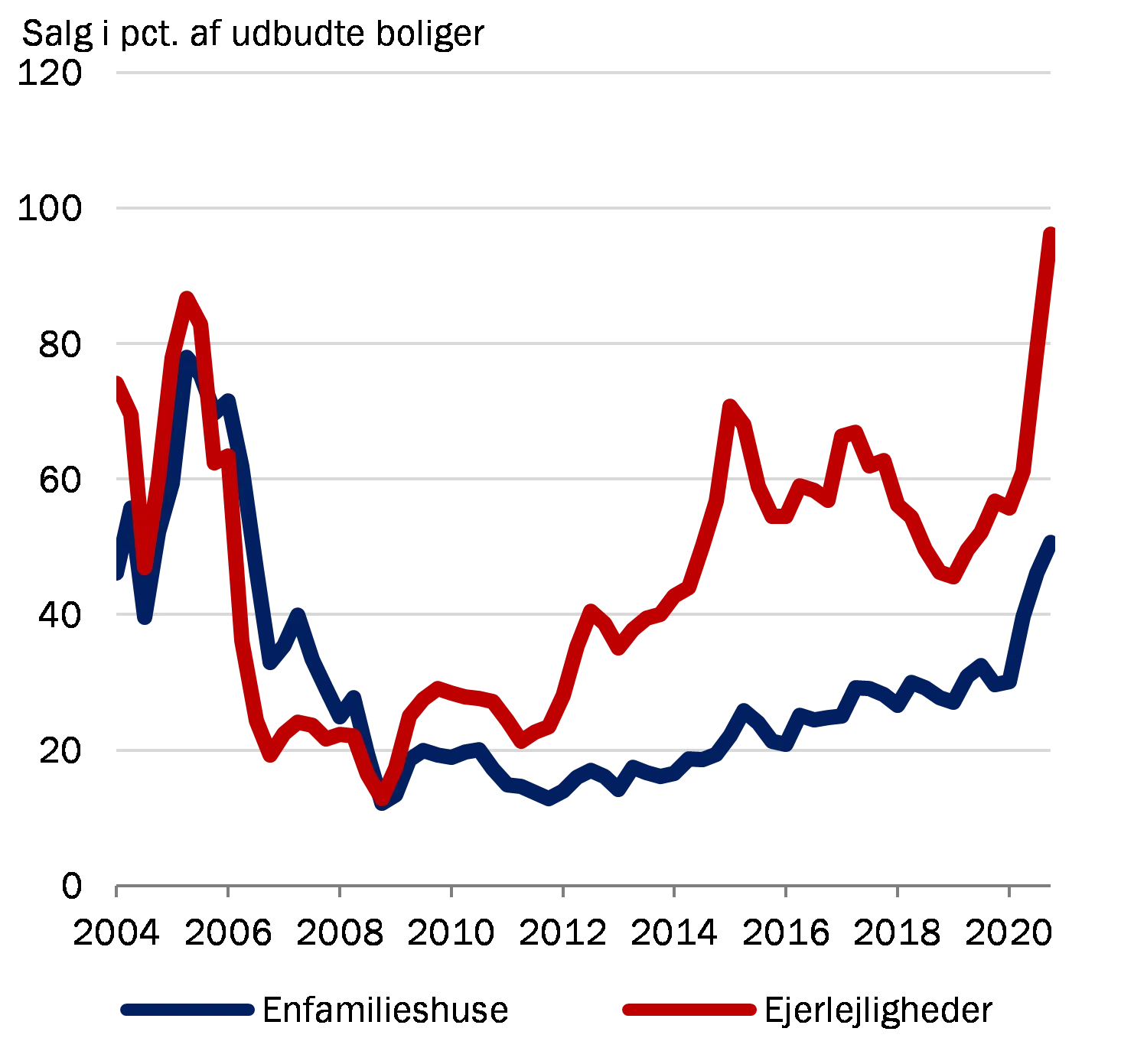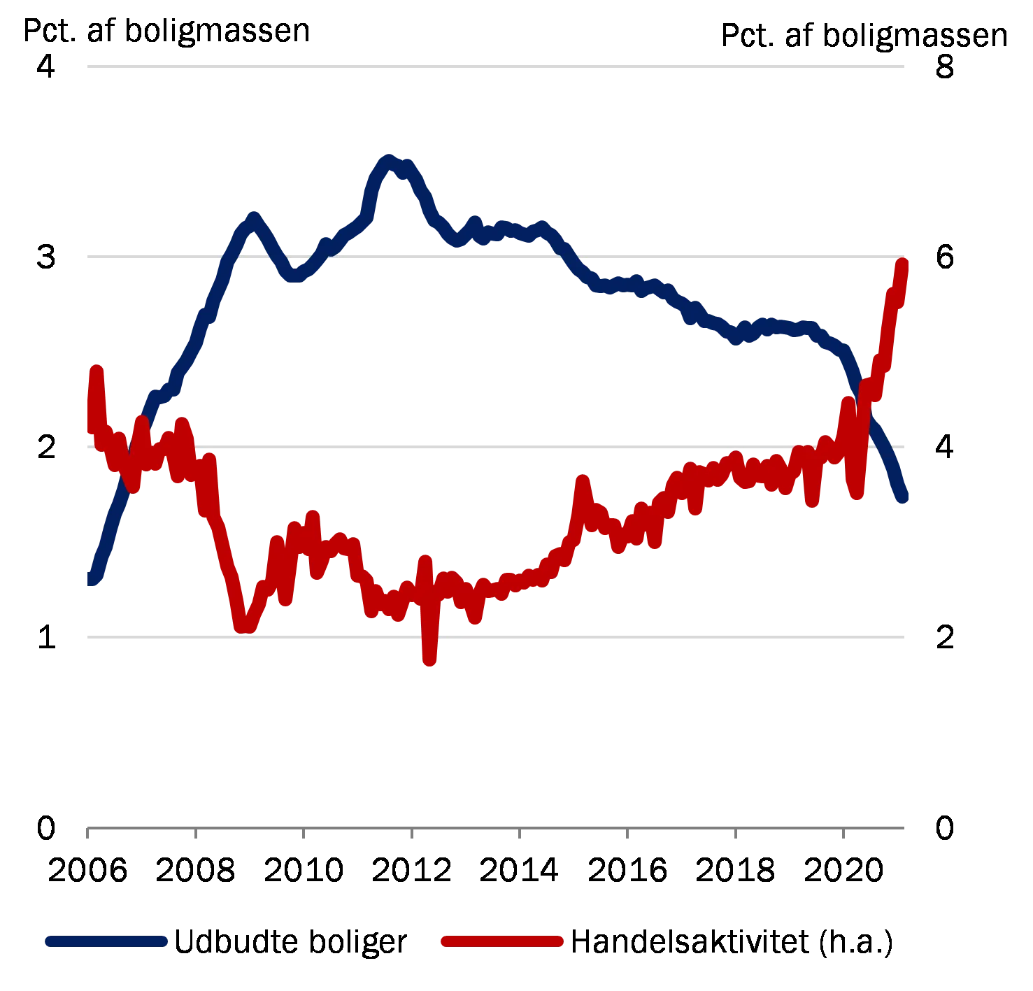 Danish homeowners are among the most highly indebted in the world in terms of gross debt relative to disposable income. The high gross debt is matched by significant assets in the form of housing wealth and pension savings, but it makes the Danish economy and the financial system vulnerable to unfavourable housing market developments. The current economic outlook coincides with soaring house prices, record levels of trading activity and a very low housing supply, close to levels in 2006, see Charts A.2 – A.4 in Appendix A. This provides ground for build-up of systemic risks in the form of, for example, loose credit standards, higher lending growth and greater optimism about continued house price increases. This exacerbates the risk that house price increases might be replaced by subsequent falls.