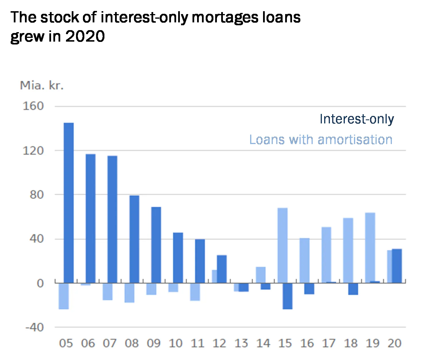 The Systemic Risk Council (the Council) recommends to the Government to restrict Danish homeowners' access to interest-only mortgage loans. The measure means that Danish homeowners cannot take out interest-only mortgage loans or mortgage-like bank loans secured upon real property if the loan-to-value ratio of their home exceeds 60 per cent. In 2020, just under half of the mortgage credit institutions' new lending to homeowners with a loan-to-value ratio above 60 per cent was with deferred amortisation. The initiative will entail that, in future, such homeowners would have to amortise on their loans or adjust the desired loan amount. The primary purpose of the initiative is to increase the resilience of homeowners – and the Danish economy – to falling house prices, increasing interest rates and other negative economic shocks that may impact the individual homeowner or Danish economy more generally.