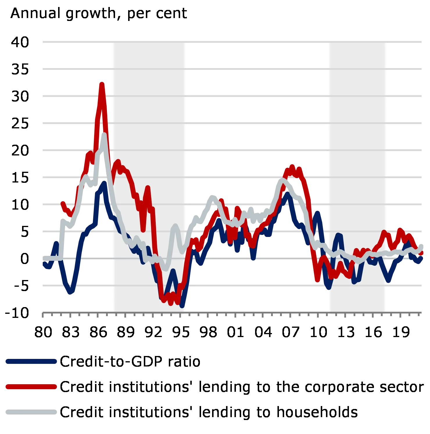 Although credit growth has been subdued as a consequence of the government relief packages for the corporate sector, it is expected to pick up as the relief packages are phased out. However, lending to households has continued to increase in the past year, and demand for loans has risen in early 2021 in step with increasing housing market activity. Even if credit growth remains moderate, the risks are exacerbated by lending already being at a high level.