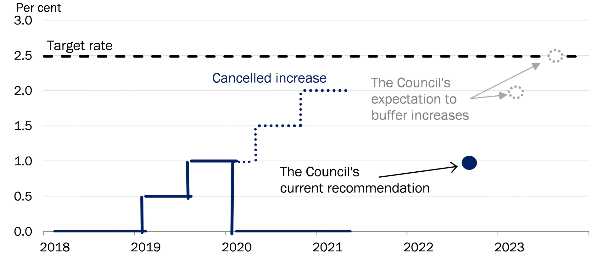 The buffer should be built up before financial imbalances become excessive and the financial sector becomes vulnerable to negative shocks. When the buffer is increased, additional capital will be built up. This capital can be released when a need arises at some point in the future. Therefore, the Council is of the opinion that the buffer rate must be built up to 2.5 per cent quickly and gradually unless there is a significant slow-down in risk build-up in the financial system. With this recommendation, the credit institutions will need to comply with a positive buffer rate from the end of September 2022, see Chart 1.