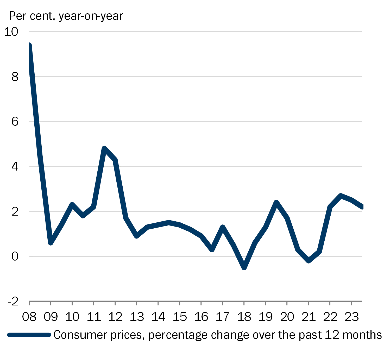 Greenland is in a long economic upswing with a tight labour market (see Appendix, chart 1, left).[3] Although rising interest rates have dampened domestic demand, the impact has been limited so far. The widespread use of fixed-rate mortgages means that higher interest rates have not increased existing interest rate costs for homeowners. Inflation was low in 2022 and 2023 (see Appendix chart 1, right) compared to the rest of the world. Household purchasing power has therefore not been eroded to the same extent as in other countries.