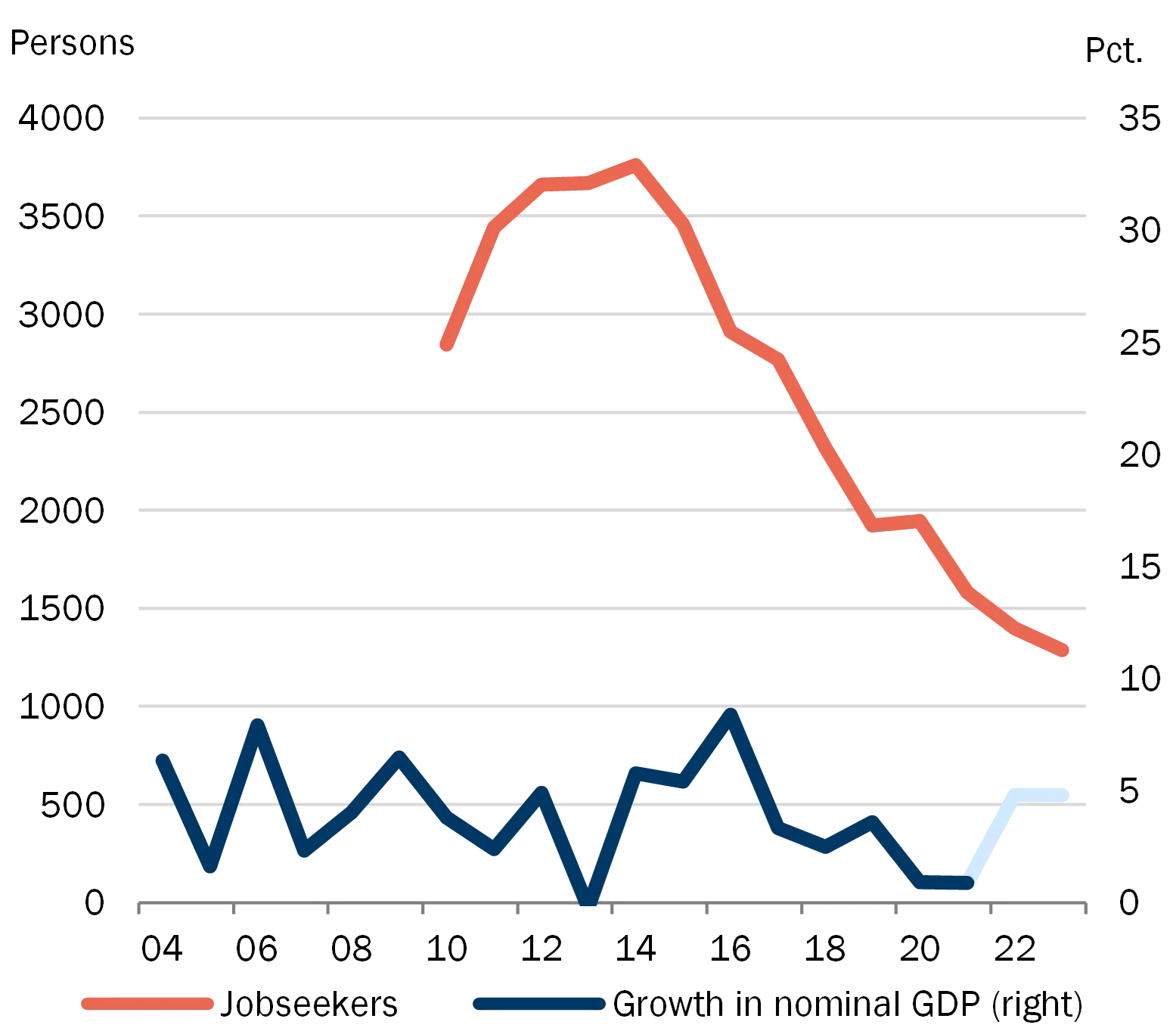 The large public sector and the block subsidy act as shock absorbers in the Greenlandic economy. Regardless of the stabilising effects, large shocks can have a large impact on Greenland's economy with a downturn in the private sector, rising unemployment and falling tax revenues. Periods of lower nominal GDP growth and rising unemployment have historically resulted in higher impairment charges for banks.