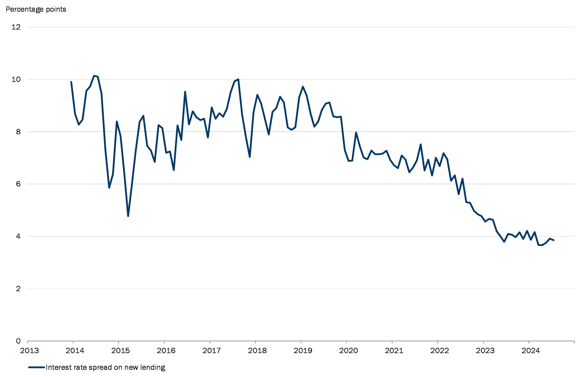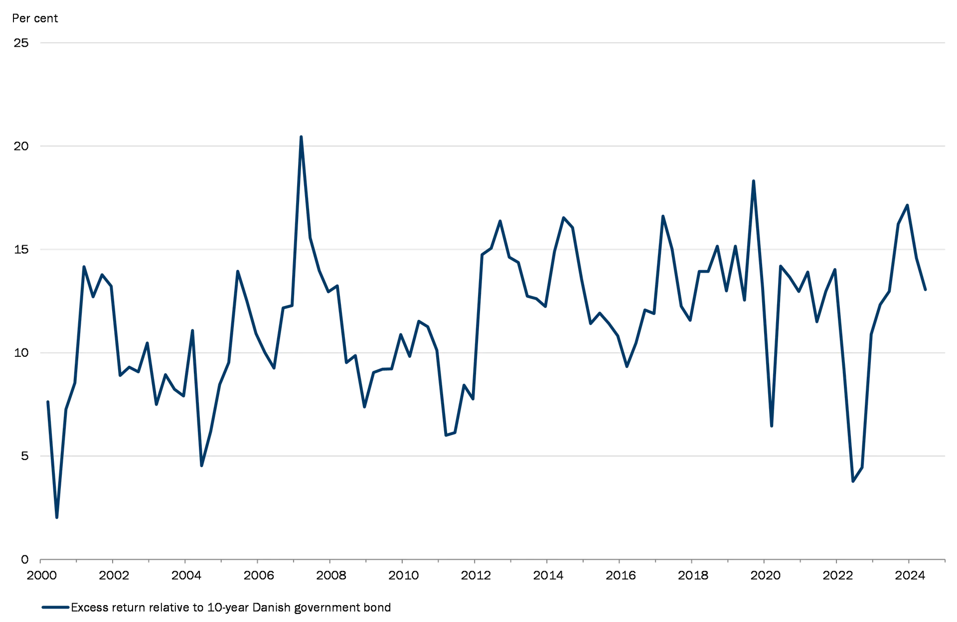 In Greenland, there may be signs that institutions are underestimating risks and relaxing credit standards more than economic developments warrant. This is reflected in the interest rate spread by institutions on new loans to Greenlandic residents, which has decreased since the beginning of 2022 (see Appendix, chart 3).[6] The interest rate spread has fallen from around 6 per cent at the beginning of 2022 to just under 4 per cent at the end of Q2 2024.