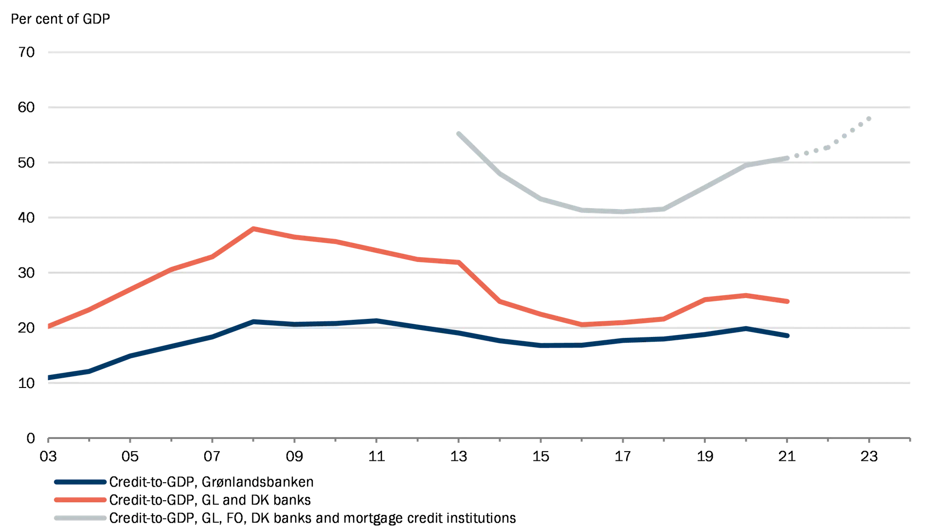 The Council is ready to recommend a reduction of the buffer rate with immediate effect if there is a risk of a severe tightening of credit to households and businesses. Foreign institutions with credit exposures in Greenland will be subject to a countercyclical buffer in Greenland as long as this does not exceed 2.5 per cent.[2]