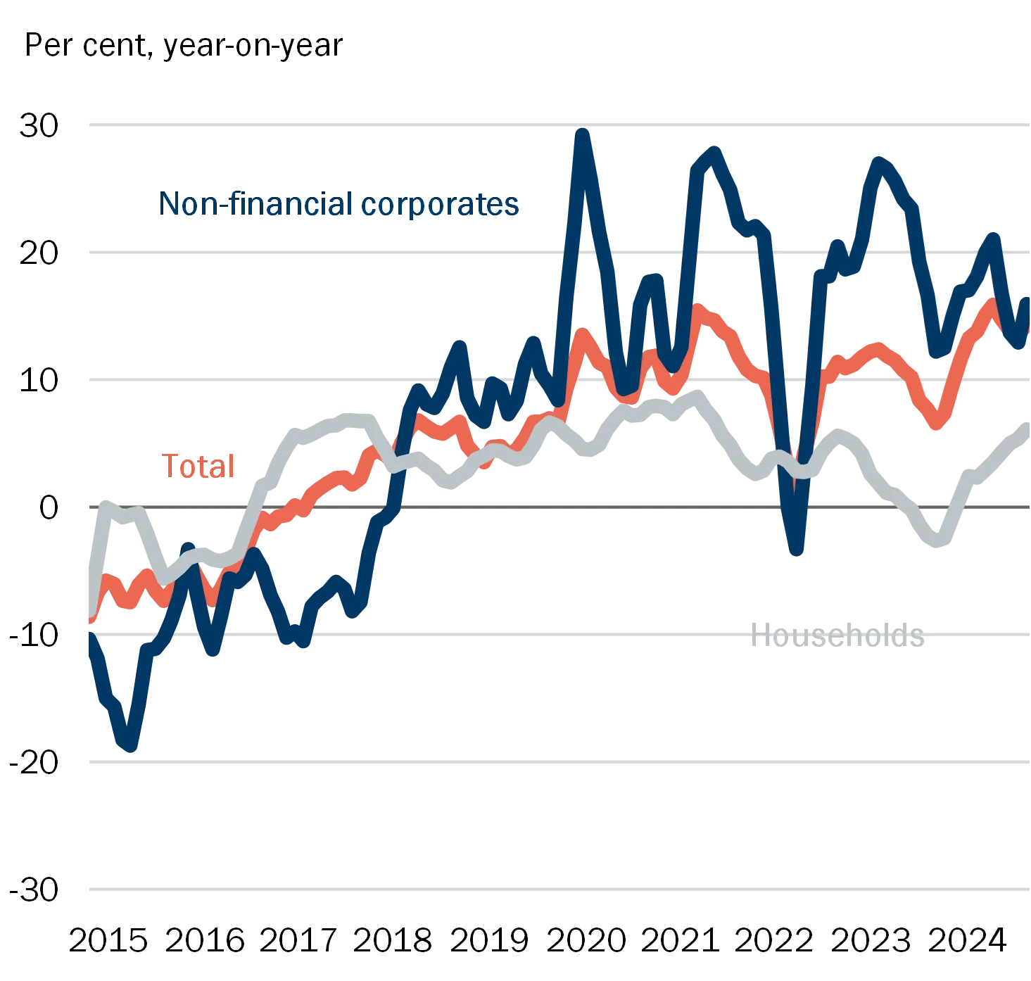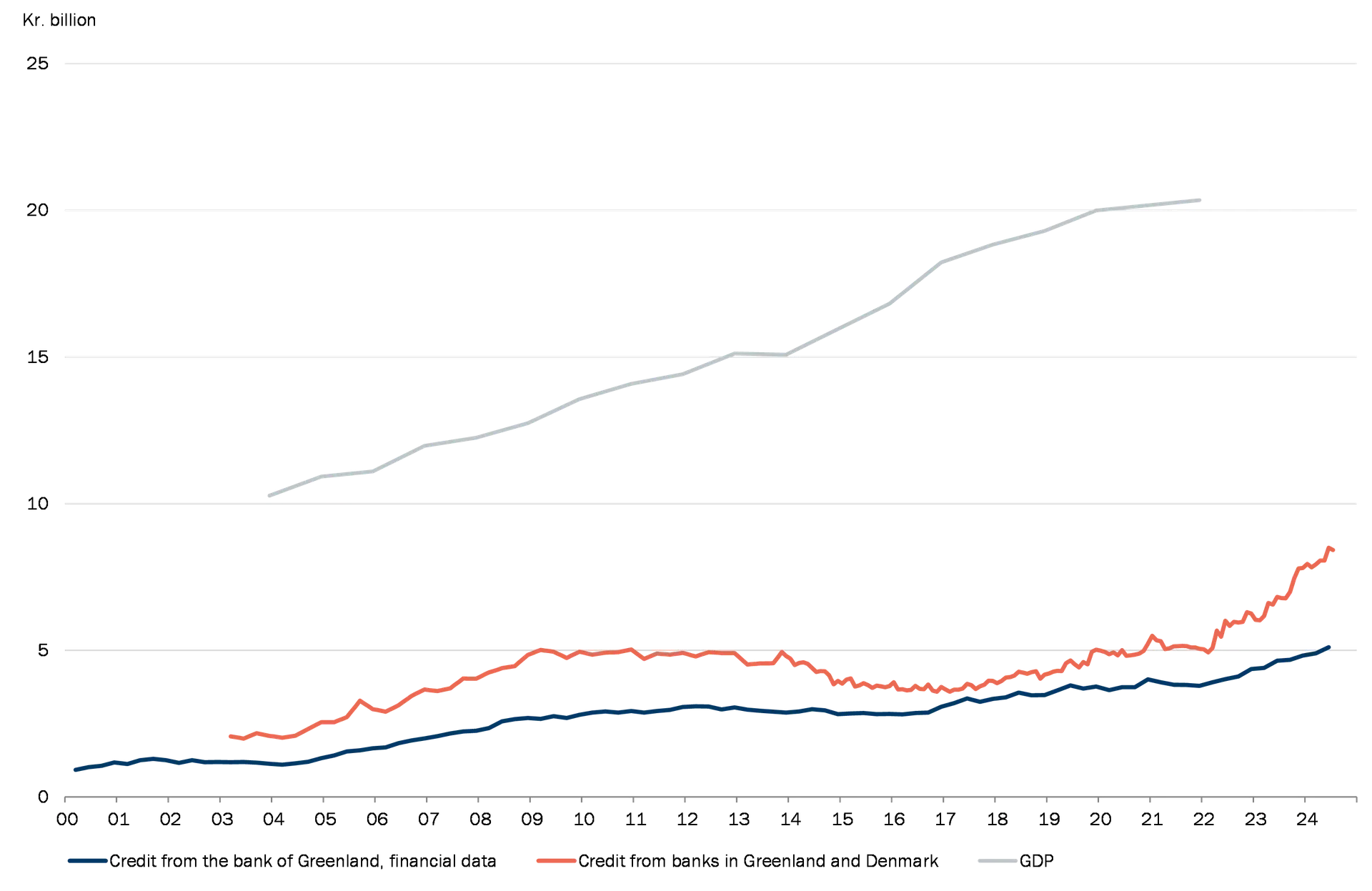 Over a number of years, there has also been strong growth in lending to businesses. There has been high growth in lending to the real estate sector, with lending doubling in the period from 2019 to mid-2024 (see Appendix, chart 6, right). The real estate sector also accounts for a significant share of lending in Greenland.
