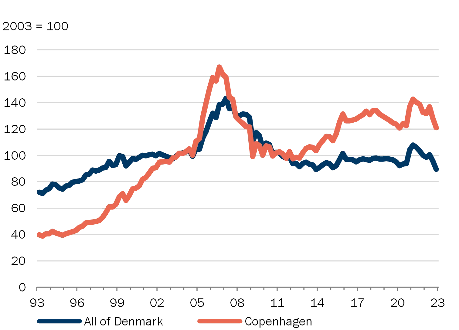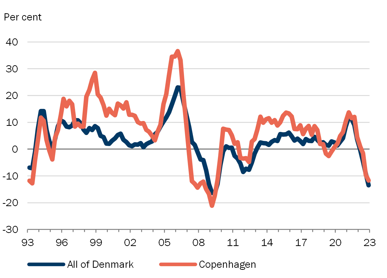 | Note: Seasonally adjusted. The most recent observations are from the 4th quarter of 2022. Left: Deflated using the consumer price index. For Copenhagen City, owner-occupied flats have been applied; for Denmark overall, single-family houses. Source: Statistics Denmark. |