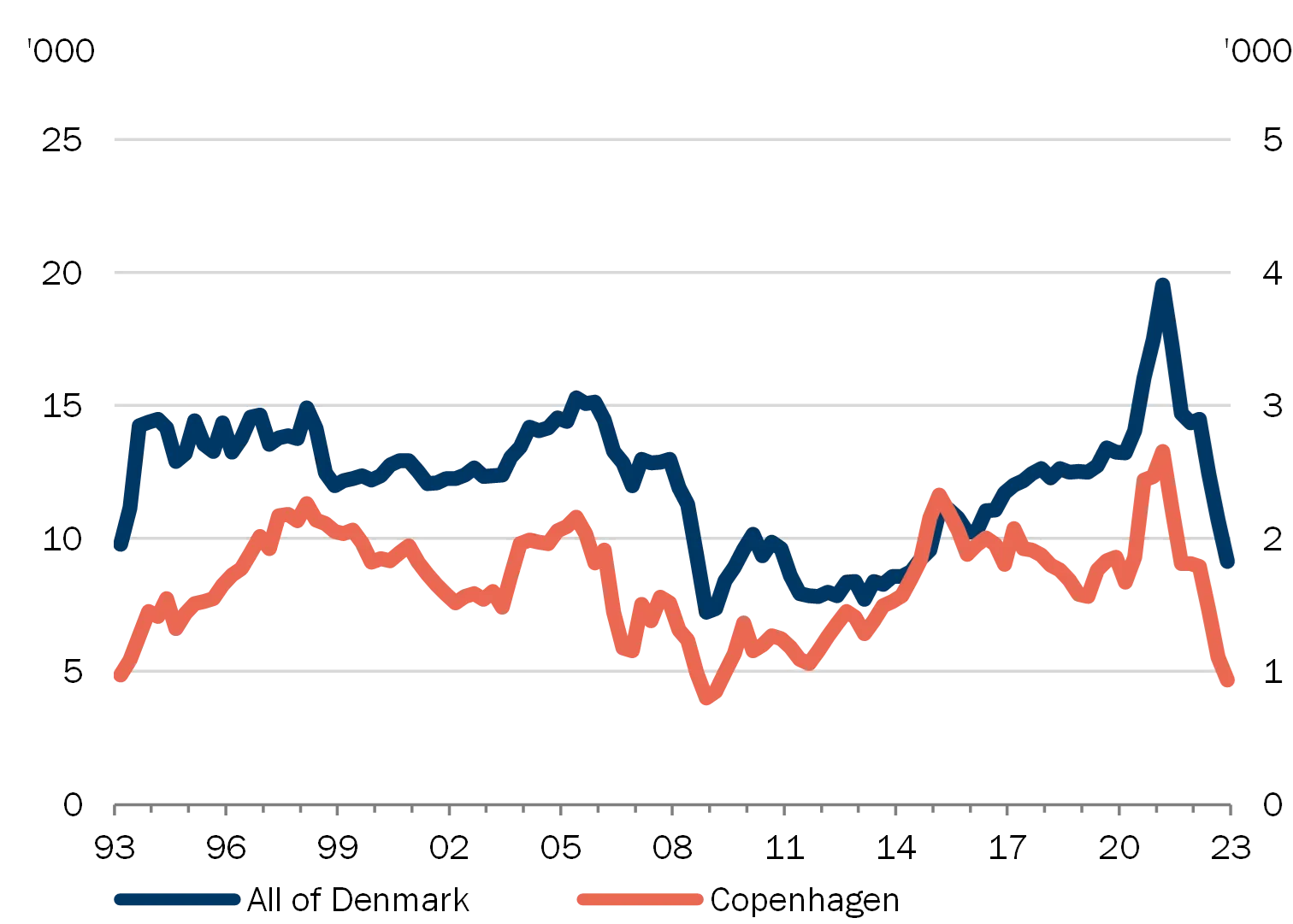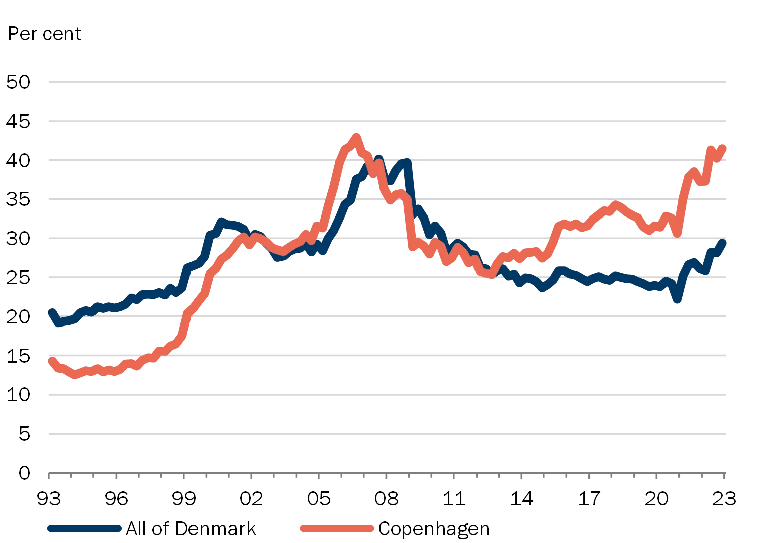 | Note: Seasonally adjusted. The most recent observations are from the 4th quarter of 2022. Both time series are affected by the early payment of withheld holiday funds in the 4th quarter of 2020. For Copenhagen city, prices for owner-occupied flats have been applied; for Denmark overall, prices for single-family houses. Disposable income is the average for all individuals in the area. Right: The housing burden is defined as the costs in the form of redemptions and interest payments after tax for an average owner-occupied dwelling financed 80 per cent by a fixed rate mortgage loan with amortisation and 15 per cent by a bank loan which is repaid over 20 years, divided by the average disposable income. For Copenhagen city, prices relate to an owner-occupied flat of 78 sq.m; for Denmark overall, a single-family house of 140 sq.m. Source: Statistics Denmark, Association of Danish Mortgage Banks and Danmarks Nationalbank. |