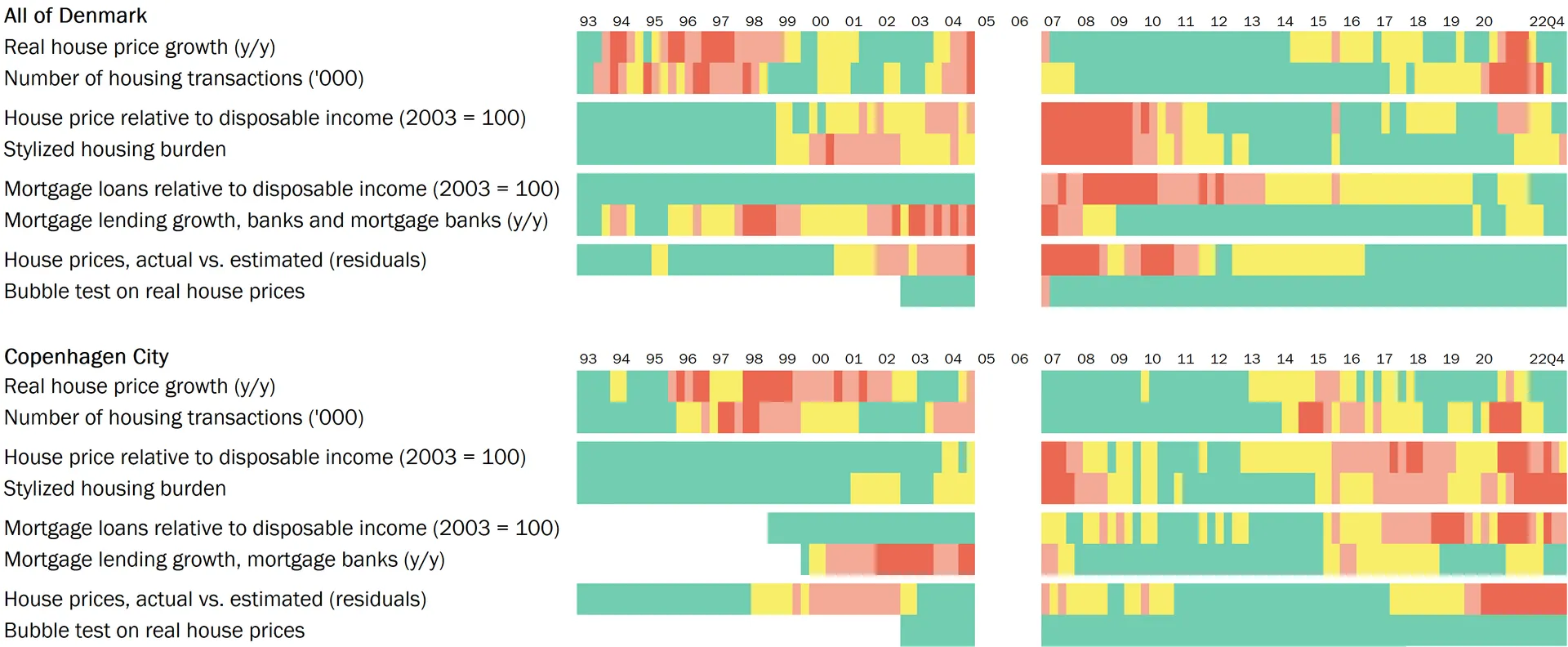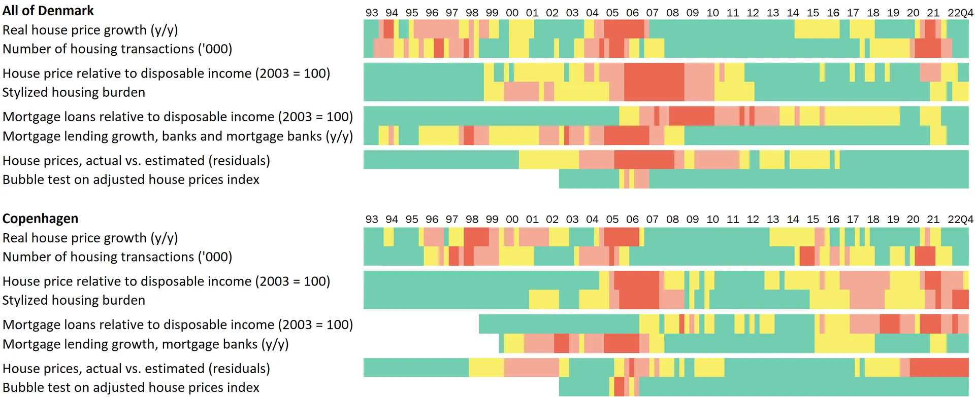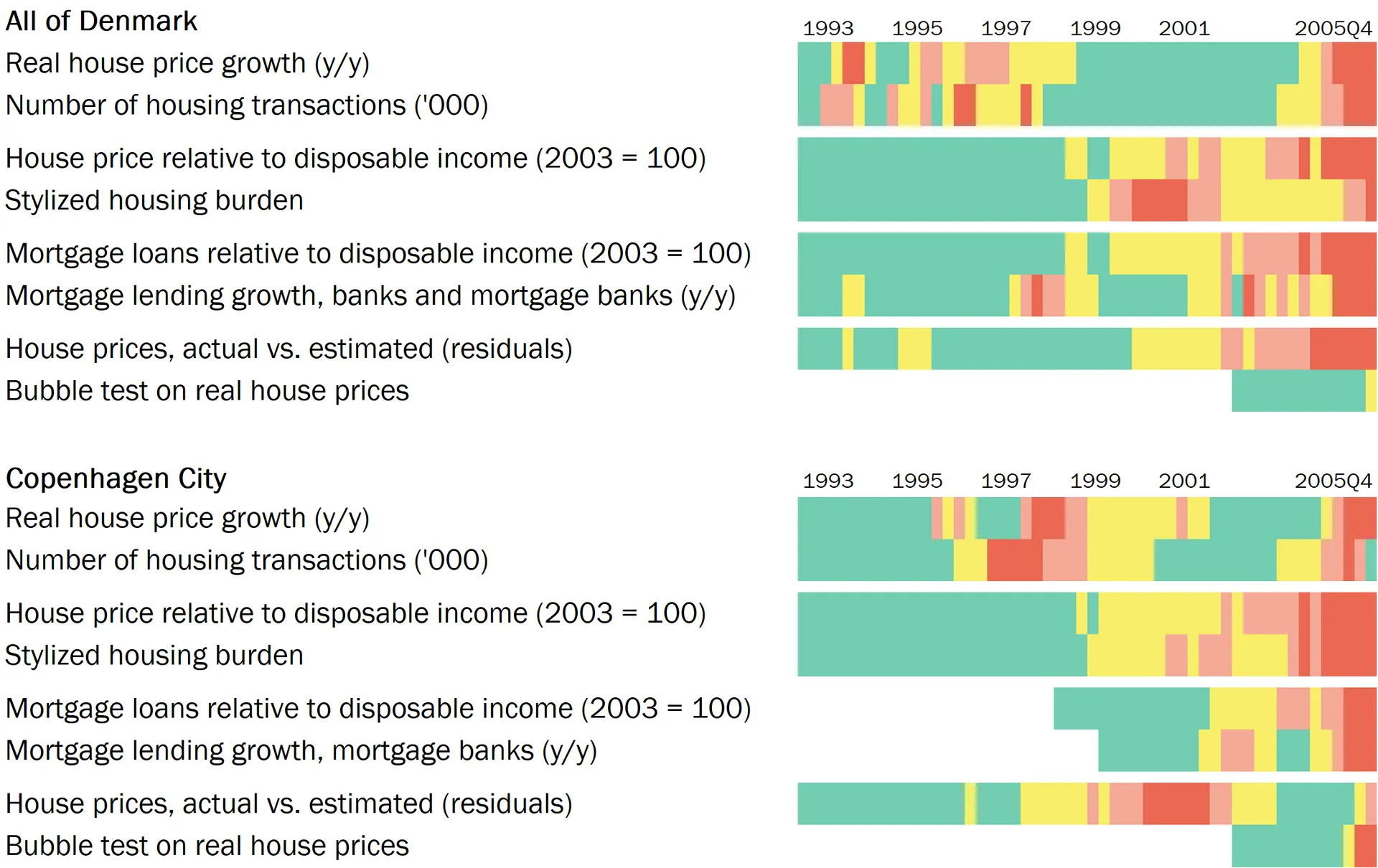 The heat map contains quarterly observations for Denmark overall and for Copenhagen City viewed in isolation. Copenhagen has been selected because both Danish and international analyses have shown that developments in capital cities tend to ripple through to the rest of the country with a lag.[2] So if developments in Copenhagen show a tendency for risks to build up, this could be an early indicator of the build-up of more general risks if they spread to other cities and areas in Denmark.