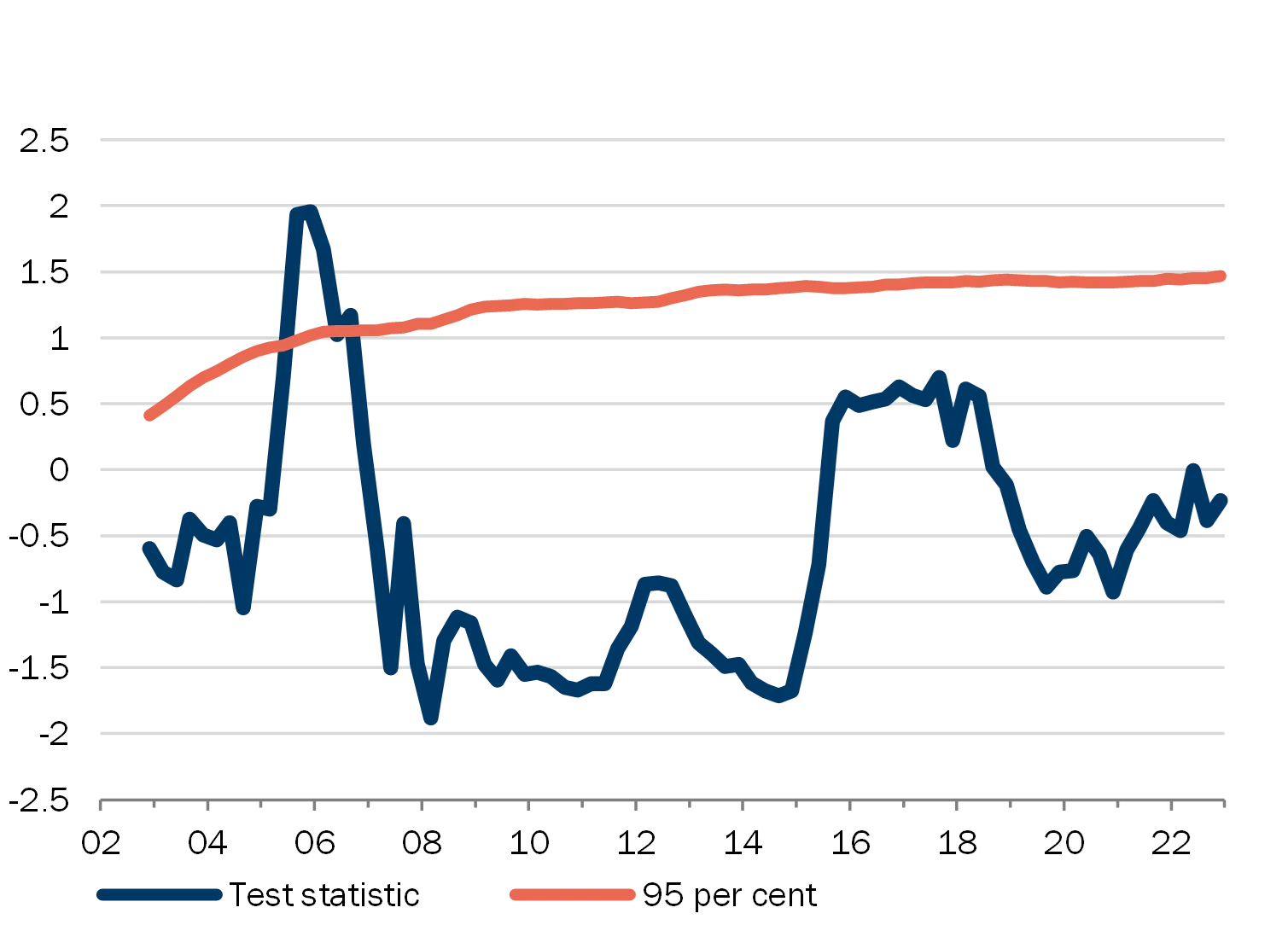 To test whether the heat map would react strongly just before the financial crisis, Chart B3 shows the heat map with the 4th quarter of 2005 as the latest observation. There are relatively few observations, so caution should be exercised when interpreting the results. However, the heat map reacts as expected.