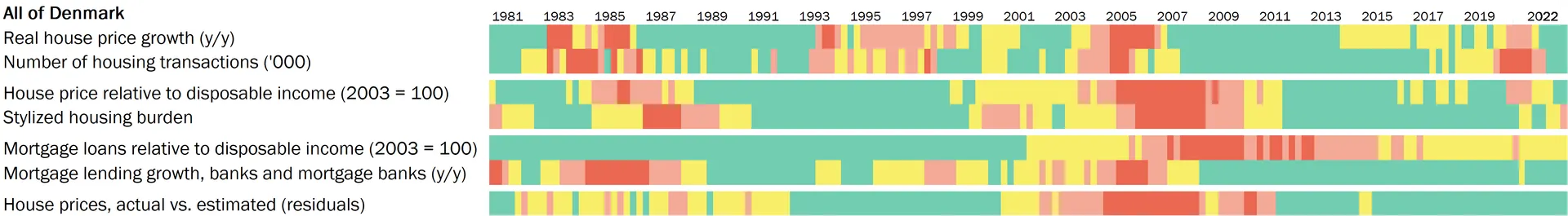 For Denmark overall, a heat map with data back to 1981 can be constructed. As shown in Chart B1, the use of longer data history does not lead to a different conclusion in relation to the temperature of the housing market at present (two yellow risk factors while the rest are green).