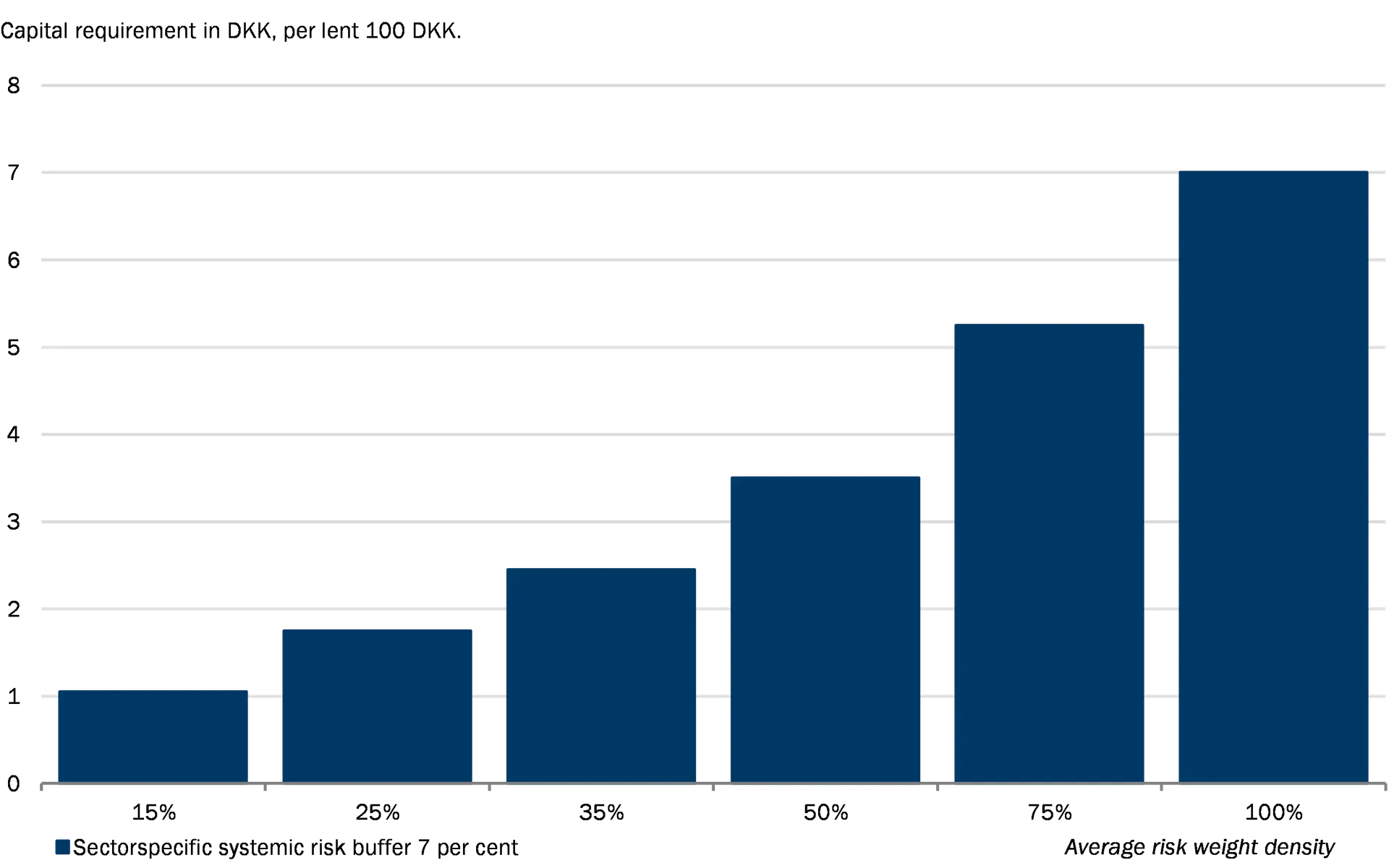 A sector-specific systemic risk buffer is set as a percentage of the risk-weighted exposures covered. It is thus a risk-sensitive capital requirement that preserves the underlying risk weighting of the exposures. This means that institutions with relatively higher risk-weighted exposures will have a higher nominal capital requirement per krone of exposure.