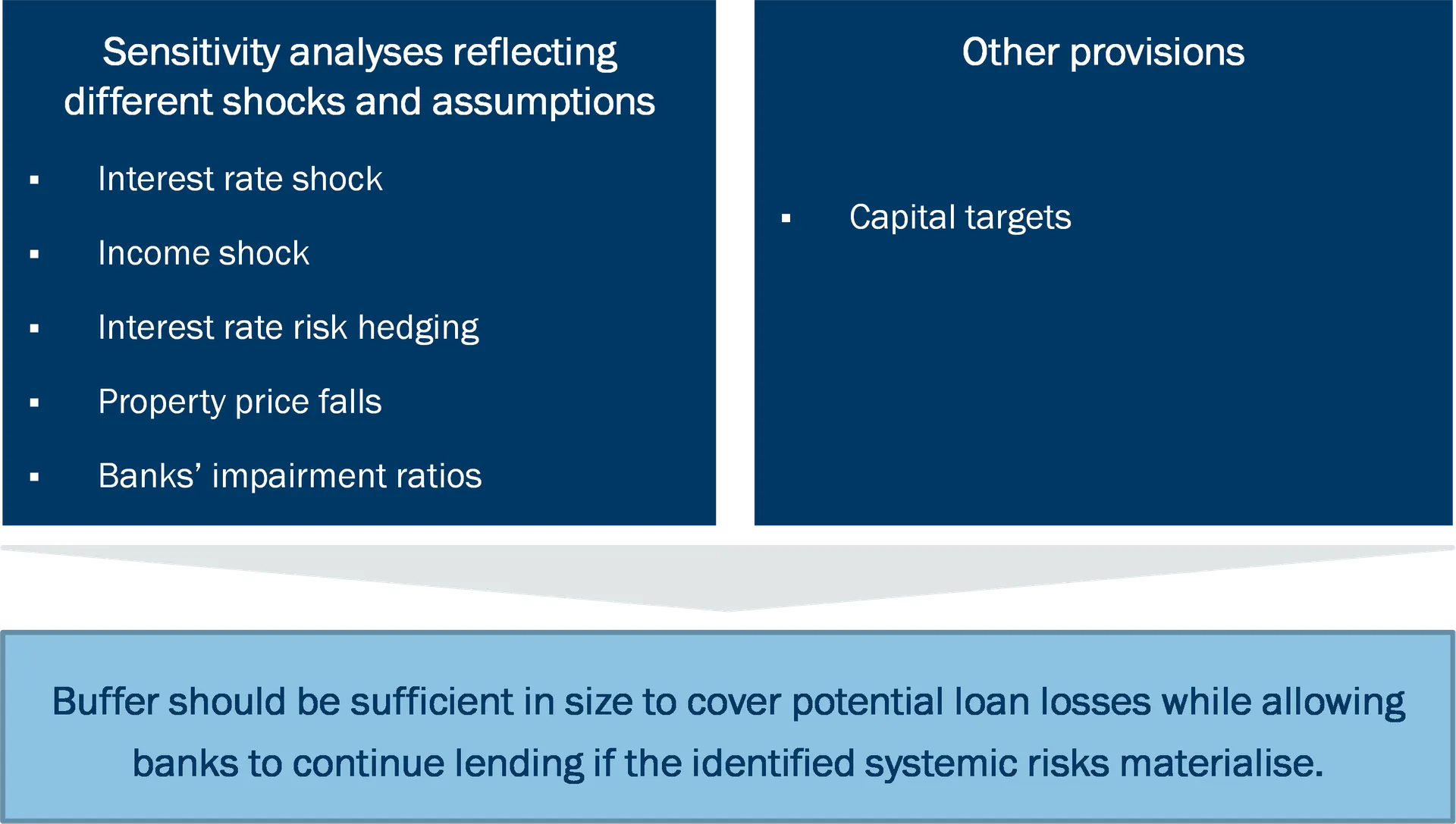Overall, the various sensitivity analyses, based on different combinations of interest rate shocks, income shocks, interest rate hedging and price falls, form a possible range of outcomes for the buffer rate.