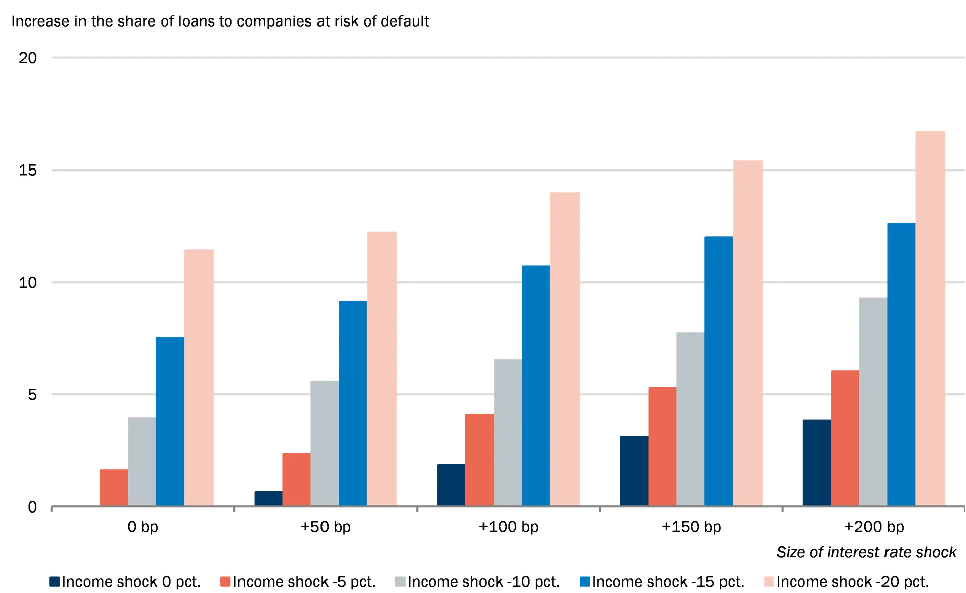 The various sensitivity analyses give an impression of how large a proportion of the loan portfolio could potentially be at risk of default (PD) in the event of the various shocks, see Chart 3. The analysis disregards companies that already do not have sufficient income to meet their financial obligations, as these risks are to some extent already expected to be managed by the institution. Credit institutions have already made significant write-downs on these loans to cover already expected losses in light of the current macroeconomic environment, but not losses that might occur in case of additional shocks. This tends to underestimate the capital need, as experience shows that there are also increased losses on customers already in distress during a crisis.